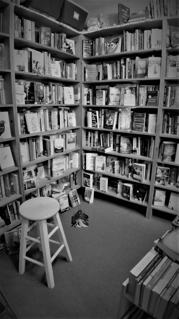 “Her eyes drifted lazily across the page, perhaps not reading so much as absorbing the typeface, the ornate chapter headers, the yellowed edges of each antique leaf. Her slow, patient movement enthralled me. I desperately wanted to see the book that she was reading. I wanted to be the book that she was reading. I wanted to sweep every other book from the shelves and reach through the labyrinth walls to her. I pushed a few volumes aside to peer through. Still, she did not look up. She turned another page, lingering on the ink-thick lettering. ‘And what kept you this time?’ she asked.”