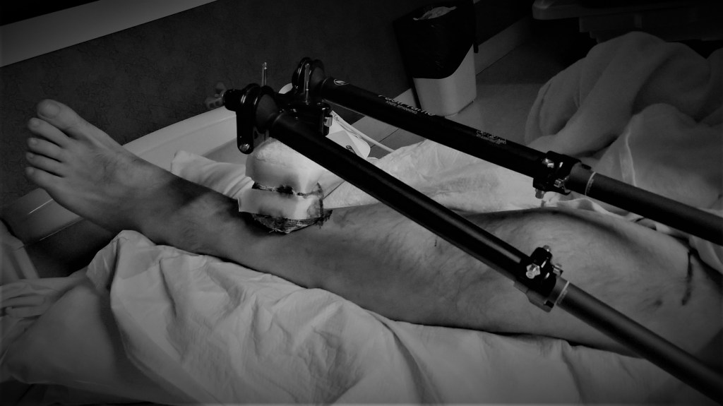 “You’ll be unable to walk on it until the swelling reduces and we are able to remove the external fixator and complete the surgery. You will be confined to your bed for the duration of your stay here. With any luck, the swelling will reduce quickly, and we might be able to get you in for your next surgery before the end of the week.”